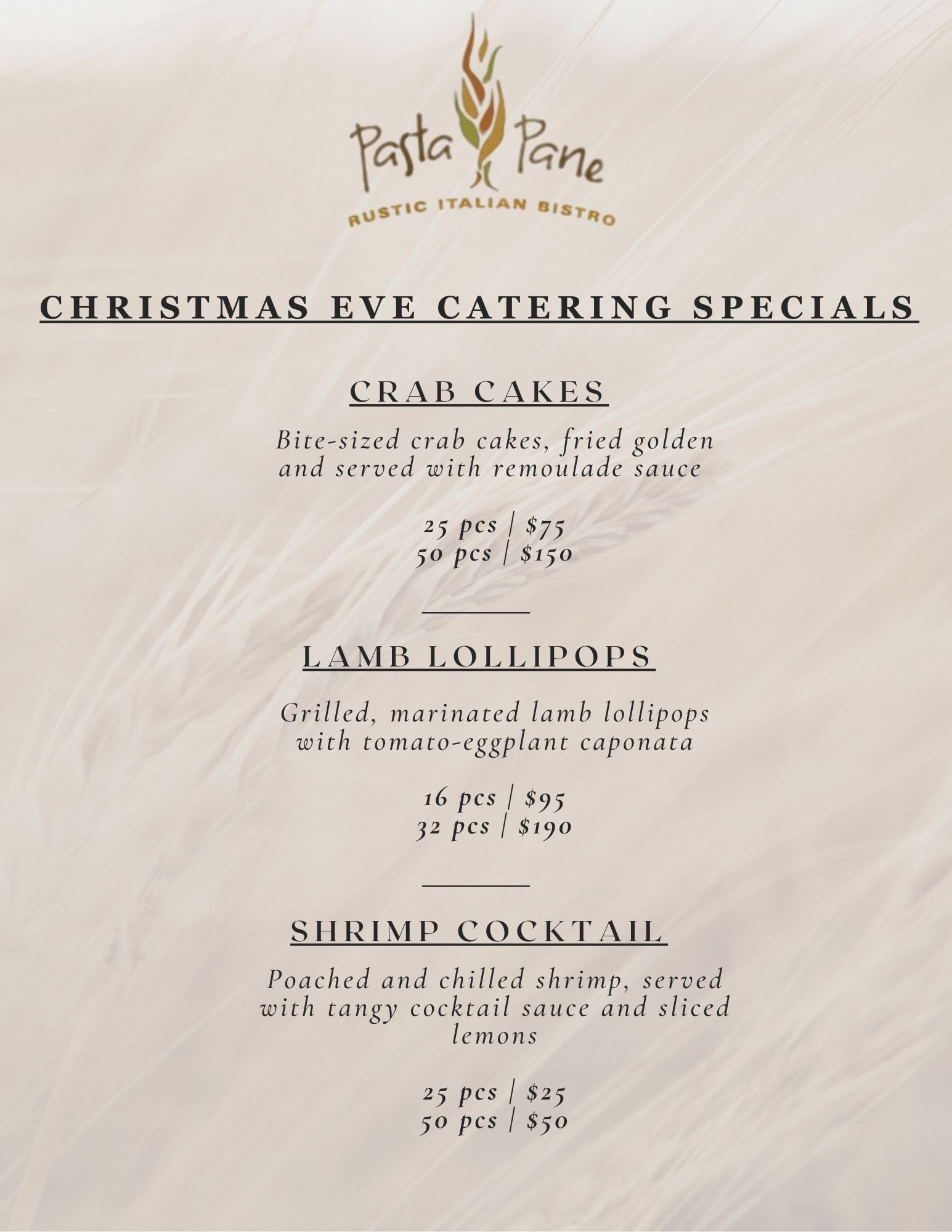 Celebrate the Season with Pasta Pane Catering! Holiday specials are available alongside our regular Dinner Parties To-Go menu PLACE YOUR ORDER HERE